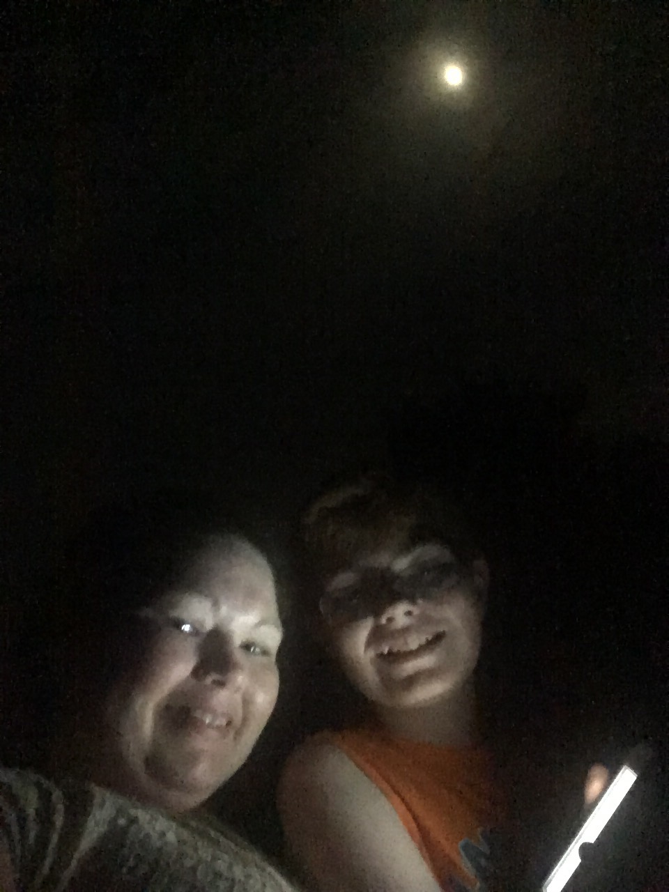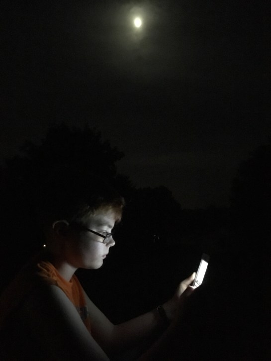 Of course, the Munchkin wanted me to keep taking pictures. It’s what we do. But armed with only my iPhone? We weren’t gonna get much. My hair was a mess. But we had two phones for light, and a big moon, so why not? In between bursts of color in the sky down the street, I snapped a couple shots: